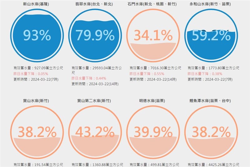 石門水庫吃緊 氣溫北涼南熱 |2024.03.22 語音朗讀 880觀看次 字級 大 中 小 石門水庫水情吃緊。圖/取自台灣水庫即時水情網站 【本報台北訊】石門水庫水情吃緊,氣象粉專「觀氣象看天氣」表示,石門水庫目前蓄水量只剩34%,新竹、苗栗地區水庫大多也都只剩30幾趴。根據天氣預測資料,未來幾天還是很乾,蓄水量勢必將持續下降,提醒桃竹苗民眾節約用水。至於還有沒有較冷的空氣南下?「觀氣象看天氣」表示,目前看來下周二晚上至周三有一股弱東北季風南下,北部、東北部稍轉涼,其他地區未來一周都是晴朗炎熱的天氣。 前一篇文章 海軍敦睦艦隊登台中港 開放2日參觀 下一篇文章 中油雙機制穩油價 下周汽柴油估降1角 熱門新聞 01從粒線體 找到修補身心靈的曙光2025.11.2902【生│活 │美│學】一花一詩 中華花藝的詩情畫意2025.11.3003南非Safari 動物舞台細細觀察2025.11.3004義國友善小鎮 人熊和平共存2025.11.3005尋光2025.12.0406【閃文集】 威尼斯印記2025.12.0207【中醫專欄】 缺能量嗎?是時候補補氣了2025.11.2908三好校園永平高中 深耕品德教育獲表揚2025.11.2909淡水、基隆、汐止21萬戶停水 爆民怨2025.12.0210首例碳封存場址 苗栗居民反彈2025.11.30 訂閱電子報 台北市 天氣預報 台灣一週天氣預報 相關報導 護理機器人 醫療展焦點高雄熊 推薦2026月曆年曆超偶聯盟 玩埤一夏烏坵嶼燈塔 點燈150周年桃猿棒球場 設毛孩專區龍崎光節空山祭 14組作品迎賓