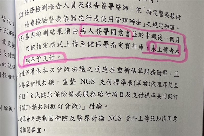 根據讀者提供的共擬會會議紀錄,健保署除要求病友提供資料,至健保署指定資料庫,若民眾不願配合就失去給付資格,但自費檢測後,若發現符合健保標靶藥物給付的基因突變,仍可獲得健保給付用藥。該份文件中指出,健保署將邀集國衛院及醫界討論資料上傳相關事宜。據了解,NGS基因資料庫應會納入國衛院人體生物資料庫整合平台。而此做法昨天也遭共擬會付費者代表、病友代表極力反對。