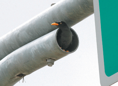【本報恆春訊】「我們的巢是銅牆鐵壁」!屬外來種的鳥類─「白尾八哥」,最近正值繁殖期,牠們選擇在道路交通號誌或指示牌的鐵管內築巢育子,可以躲避天敵,也可免遭人為破壞,繁殖成功率高,不斷在拓展地盤。但躲在鐵管內,氣溫高、也較難避風雨及無法遮蔽,有時會遭到猛禽如鷹類攻擊。