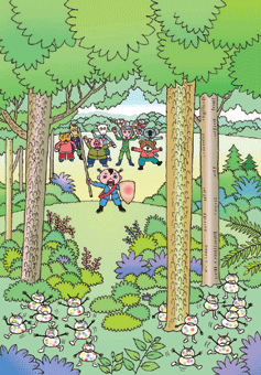 「常並毒」妖怪這麼壞,大家再也不能忍耐,決定要把他們一起趕出森林外。馬村長說:「大家快去尋找這方面的人才。」「什麼人才?」「至少也要『力氣大、跑得快,不怕雨淋、不怕日曬,頭腦聰明、而且有英雄氣概』。」