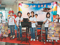 【本報澎湖訊】澎湖縣馬公市東衛國小直笛隊不僅參加全國音樂比賽連獲三年優等,個個還是能歌善舞的小小「街頭藝人」。指導老師歐育庭說,他為直笛團爭取各項演出機會,從醫院、博物館、戶外展場到名勝古蹟廣場,最近還成為縣府機場入境大廳迎賓駐唱團。小團員經過街頭歷練,表演風格優雅活潑,令人印象深刻。