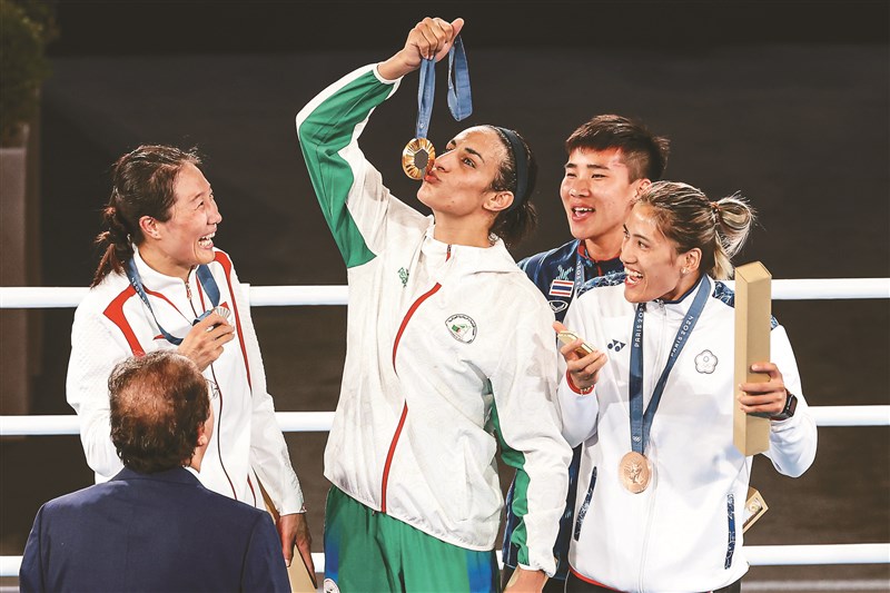 在巴黎奧運與我國拳擊好手林郁婷一樣捲入性別爭議的阿爾及利亞選手克莉芙(左二),獲得女子66公斤級金牌,同個量級的我國好手陳念琴(右一)獲得銅牌。圖/季相儒