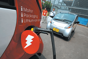 這台最新的日本三荾電動車,只加電不吃油,最高時速還能達到每小時一百三十公里。圖/法新社