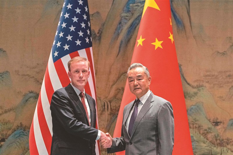 中國大陸外交部長王毅(右)和美國白宮國家安全顧問蘇利文(左),27日在北京雁棲湖會面。圖/法新社