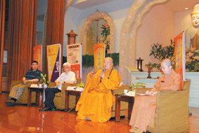 「子德芬芳—二○○八全民閱讀博覽會」五日於佛光山舉行對談,在人間佛教讀書會總部執行長覺培法師(右起)提問下,佛光山開山星雲大師與柴松林教授、大陸學者錢文忠教授三人,針對譗閱讀品格豃的議題有一番精采對話。圖/人間社記者莊美昭