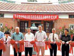 副總統蕭萬長、國民黨主席吳伯雄和桃園縣長朱立倫等人,在新屋范姜祖堂前舉行修復落成剪綵儀式。劉愛生攝