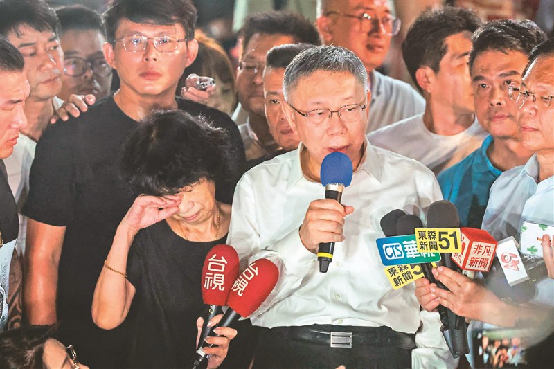 台北地檢署偵辦京華城案,台北地院認為,檢察官舉證無法認定前台北市長柯文哲犯罪嫌疑重大,昨凌晨3時裁定柯文哲(中)無保請回,隨後發表談話,其妻子陳佩琪(左)陪伴在旁且不斷拭淚。圖/中央社