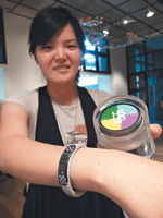 郭芳佑的作品「芳動」(右圖/李鋅銅攝),是一只流線型的科技手環,可看時間、溫度,也可聽音樂,跑步時還能計算卡路里,並能依各人喜好,散發不同芳香,充電座甚至結合粉餅盒,專為女性設計。