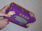 把小包的面紙由上方已開的口放入,若要用到小包面紙時,可由底部剪裁的洞口抽出即可,有點類似銷售面紙的自動販賣機一樣,只要將這個面紙收納盒放在顯眼的地方,就可以免去東找西找的困擾了。