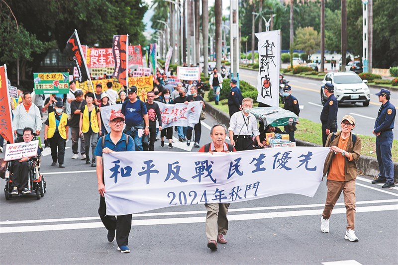昨天的秋鬥遊行有兩百人參與,今年訴求「和平反戰,民生優先」。圖/曾原信