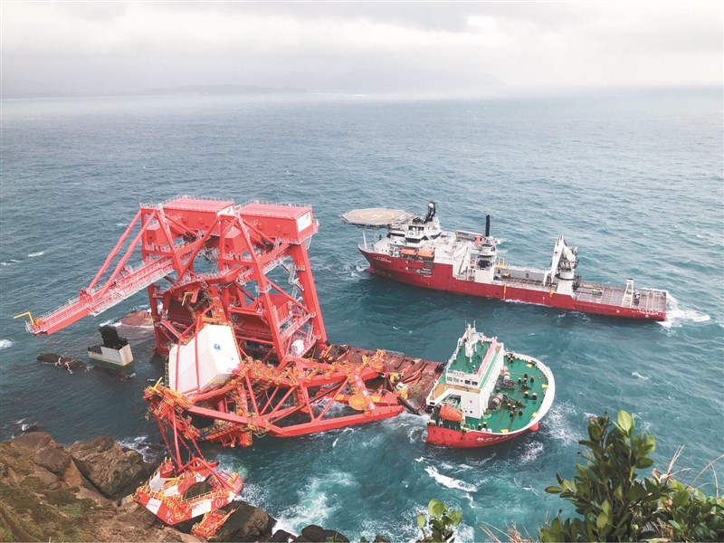 中國大陸「鈺洲啟航」貨輪(前)10月31日凌晨擱淺在新北市野柳岬海岸,船上裝載247噸重油、37噸柴油和6280公升滑油,各界憂心油料外洩汙染海洋。交通部航港局協調具備動態定位系統工程船「東方建設者」(後),協助推進抽油作業。交通部長陳世凱昨表示,預測今早6時海象會好一點,如能順利把抽油機具放到擱淺的貨輪上面,希望14日開始抽油,並在2周內把貨輪的油抽光,化解汙染危機。圖/中央社