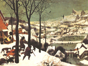 著名的傳世之作《雪中獵人》,畫家以站在山頂的角度遠視全景,畫面的動靜處理異常巧妙。前景濃黑色的樹木,穿越於樹林間的獵人和狗,遠處溜冰者的身影,在白雪覆蓋的地上顯現黑白分明的剪影效果。觀者的視覺焦點從前景被拉到延伸的山谷內的村莊和遠處的天際。原本肅穆寧靜的畫面,因為前景的獵人,林間的獵狗和小酒店前忙碌地燒烤的農民,已經動了起來;遠處的溜冰者、飛翔的鳥,讓沈靜的山野出現一絲生機。畫家在處理人物,空氣和光,充滿了冬天寒冷透明的感覺。