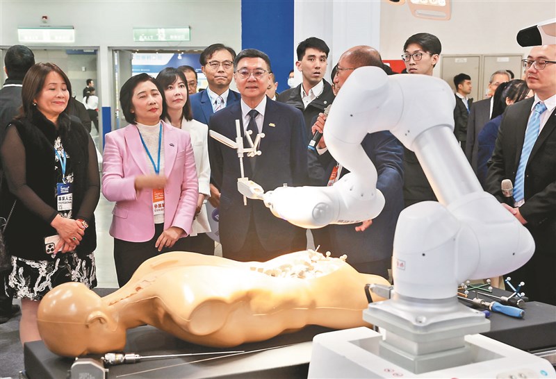 台灣醫療科技展昨日在台北市南港展覽館1館展出,行政院長卓榮泰(前左3)昨前往參觀台灣醫療科技展,並親自體驗達文西機器手臂,逐一了解機器人微創手術、AI新藥研發、中風病人手部復健新科技等。卓榮泰感謝所有研究團隊、廠商、學者發展健康科技,可達成總統的「健康台灣」治國理念。圖/中央社