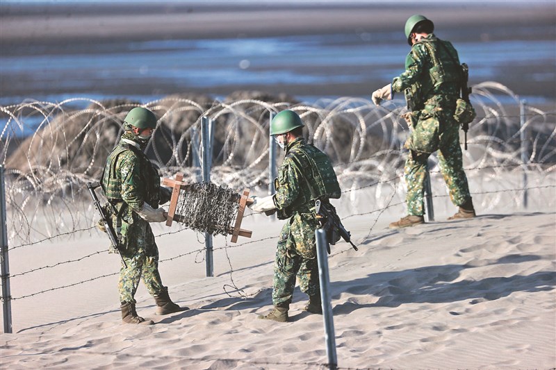 國軍昨在台中大甲海灘實施軍事訓練,工兵群演練科目灘岸阻絕設置。圖/黃仲裕