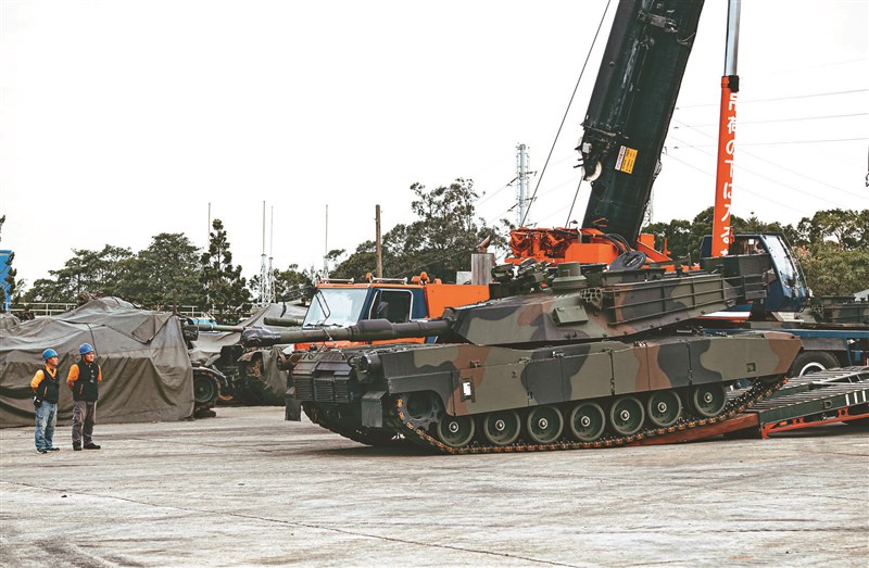 向美採購M1A2T戰車的首批38輛,連同4輛M88A2裝甲救濟車,昨由台北港運抵新竹湖口裝甲兵訓練指揮部。圖為M1A2T戰車從運輸車輛「下板」。圖/國防部提供