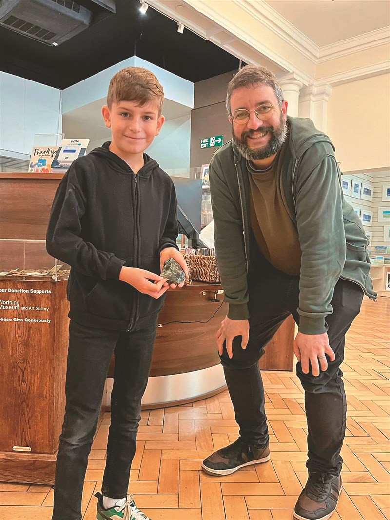 班(左)在海邊撿到一顆黑色石頭,發現是極其珍貴的史前石斧,連博物館也借來展覽。圖/FB@Worthing Museum
