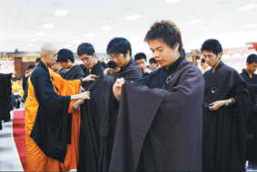 【人間社記者文軒、陳德啟大樹報導】由歌手劉德華主唱的「忘情水」,十一日晚上在佛光山旋律重現,引起驚動的主角是叢林學院院長慧寬法師,引吭高歌將歌詞轉換成「千錘百鍊出深山,烈火焚燒莫等閒;粉身碎骨都無怨,留得清白在人間。」千餘名青年熱情的歡呼聲與掌聲響徹雲霄,隨著歌聲啟動飛揚的青春,樂活在三皈五戒的世界。