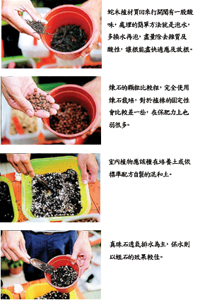 真珠石:較不具有的吸水能力,透氣排水為主,保水則以蛭石的效果較佳,如變成粉末狀它的吸水與排水性喪失。