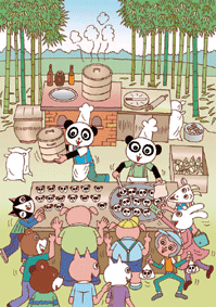 從那天之後,阿豐和阿源就一直練習做竹筍包,而且還研發新口味、新造型的包子。餡料部分,除了鮮嫩、香脆的竹筍外,還加上薑絲、木耳、紅蘿蔔絲和香油,味道更棒了;外觀部分,他們用兩片香菇做成兩片耳朵,剪了兩張圓形海苔貼成眼睛,還畫上鼻子和嘴巴,看起來就像是一個可愛的「貓熊的臉」。