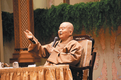 有人發問,以佛教觀點來看,世界為什麼會發生災難?應該以什麼態度面對災難?大師告訴大家,並不是現代才有像地震這種重大災變,只是因為現代的傳播媒體發達,讓我們很快就知道災難的發生。因為人類對於眾生沒有愛心,弱肉強食、適者生存,大家身造殺、盜、邪淫,口說妄語,心起貪瞋癡,累積許多惡業,自然會產生災難的結果。想要消弭災難,要從人性改造,減少殺業、欺騙,和平相處,帶來祥和。人類要互相幫助,相容相存,不能只靠佛菩薩,佛菩薩雖然也救苦救難,但是因果也不能違背。佛教認為因中有果,果中有因,平常要「隨緣消舊業,莫再造新殃」,讓人生淨化。