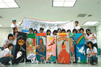 漂鳥團學員到離西來大學二十分鐘車程的West Covina圖書館,在圖書館館員Rachel Magee的指導之下,二、三人一組,各組挑選兒童館館藏的不同類別,研讀該類別圖書後,將組員認為最能代表該類別的圖案畫在布上並著色。