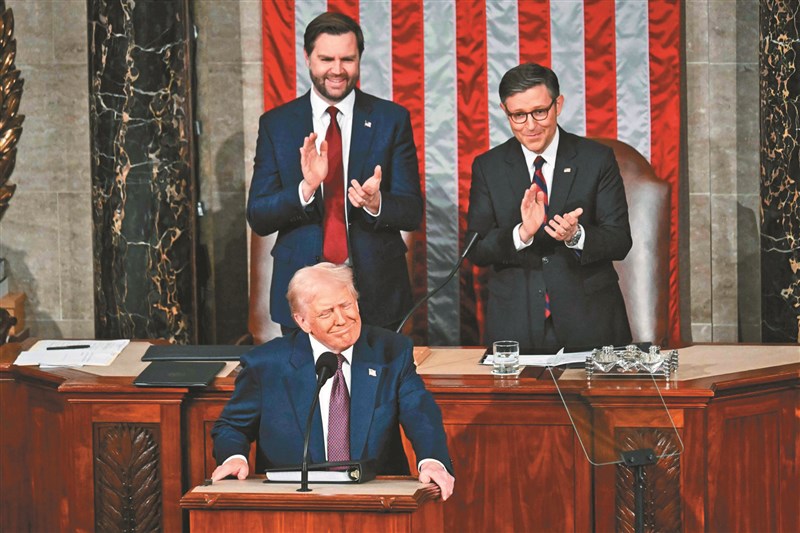 美國總統川普(前)4日發表上任後首次國會演說,副總統范斯(後排左),眾院議長強生(後排右)頻頻起立鼓掌。圖/法新社