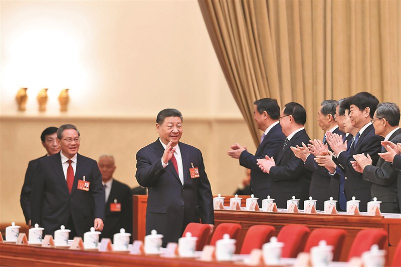 中國大陸第14屆全國人大三次會議5日在北京人民大會堂開幕,習近平(中)等人出席。 圖/中新社
