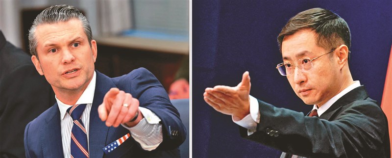 回應美國關稅戰,中國外交部發言人林劍(右)說,不管是貿易戰或其他什麼戰,中國都將奉陪到底;美國防部長赫塞斯(左)聲稱已準備好。圖/取自網路