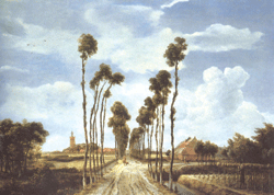 認真說來,這不過是歐洲小鎮一幅日常隨處可見的農村風景,由於霍貝瑪將圖畫中的地平線拉得很低,襯得天空益發遼闊無邊,此時寬廣無際的空中那朵朵形狀各異的白雲使人留下心曠神怡的美好感覺。