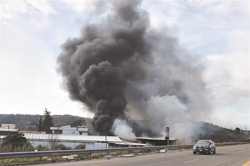 敘利亞安全部隊和忠於前總統阿塞德的戰士,七日在沿海城市拉塔基亞近郊發生衝突,一間工廠冒出濃濃黑煙。圖/美聯社