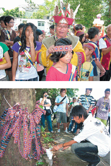 【本報花蓮訊】撒奇萊雅族去年正名後,首度推出青少年成年禮「木神祭」。一群青少年昨天學習耆老在花蓮市國福里部落內一株老茄苳樹下學習祭儀,並接受耆老繫綁象徵成年的頭飾,場面莊嚴。