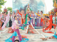 敦煌舞者的服飾色彩繽紛,深具美感,舞者眼神溫婉,和擔任「四大金剛」的男舞者,呈現出陰柔恬雅與陽剛奔放的衝突美感。