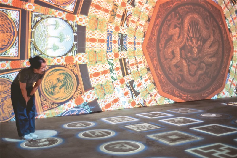 昨日香港首個以北京中軸線為主題的「中軸有禮」沉浸式互動展覽,在數碼港商場內展出,展覽以數位科技結合北京中軸線的歷史文化、禮制、建築美學等,通過動態網紗投影、體感互動、人工智能等技術,將藝術與科技融和,讓傳統文化在互動中煥發新生。圖為工作人員演示體感互動與北京中軸線建築的結構、紋樣相結合的內容。圖/中新社