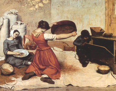 這次獨特的個展,包括他的重要作品「篩穀的婦女」。畫中的主角人物,跪在地上篩穀的婦女,背對畫面,沒有看見臉孔,但她的樸素勤勞通過她的勞動非常生動地揭示,另一個斜斜地倚在糧包上的婦女,畫家刻畫她疲憊的神情,然而雙手不停工作。庫爾貝非常具體並突出表現了農村姑娘特有的勤勞品質和健康形象。