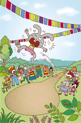比賽的日子││八月八日終於到了,小灰兔、紅狐狸和其他選手都來到跳遠比賽的場地。紅狐狸抽到一號,他走向「起跑」的地方,吸一口氣後慢慢助跑、加速、踩踏板、用力一跳。「哇!好遠喔!」「一定又是他第一。」「好厲害喔!」「紅狐狸真不是蓋的!」