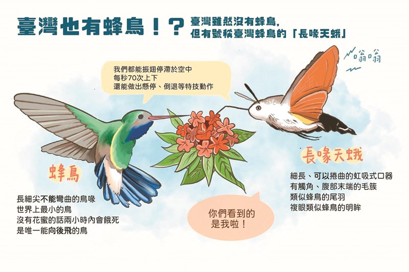 飛天小龍蝦 不是蜂鳥 是天蛾 文/派翠西亞 |2025.08.17 語音朗讀 3134觀看次 字級 大 中 小 小豆長喙天蛾。 圖/土魯斯博物館大透翅天蛾猶如吸蜜中的飛行小龍蝦。圖/伍仕集可隨花型自由彎曲吸管。圖/蔡添富長喙天蛾停歇時像一架戰鬥機。 圖/Home Run Taiwan蜂鳥和天蛾的異同比較。繪圖/Home Run Taiwan 文/派翠西亞從春暖到天涼,在台灣的野外,很常可以在開花植物附近,看到一種可以停在半空中吸花蜜的動物,飛行時像鳥一般振翅,懸停時也可以扇翅定翼浮在空中,但體長大約僅5~7公分,說牠是蜂鳥,但蜂鳥一般只在北美洲四季皆有繁花的地區出現,既然如此,這究竟是哪種動物呢?在台灣野鳥攝影 Photo-eye鳥訊FB社群上,及在Home Run Taiwan的FB社群上,經常有鳥友拍到這些被戲稱為「台灣蜂鳥」的動物(別名「蜂鳥鷹蛾」、「飛蝦」、「昆蟲界的四不像」),只要放上網總能引發一陣討論,甚至有不少人誤以為牠們是蜜蜂、蝴蝶或袖珍鳥。連達爾文也在找尋牠看起來像小型鳥類,但其實牠是大型天蛾,且隨身帶著一根或直或曲、能彎能捲的吸管,不論是吸花蜜的影片或照片,或是停在半空中振翅的身影,總能引發網友一番討論,而最後結論總是以:「不敢靠太近,但全程觀賞」;真的很像一隻「飛天小龍蝦」或「飛天小砲彈」為結尾。是的,這種曾讓「演化之父」達爾文直到離世前都找不到答案的物種,其實是一種外型像蜂鳥,也具備蜂鳥吸蜜功能的長喙天蛾,其下有100多個種類,外觀造型、顏色、翅膀結構各不相同,但都有渾圓而粗壯的身軀,停歇時甚至常被形容如「一架戰鬥機」。台灣長喙天蛾屬的天蛾一共有18種,較為常見的約8種,牠們的棲息地非常廣泛,主要活躍於海拔100~700公尺高的次生林、灌叢林、風水林和草地,甚至有物種棲息於紅樹林或農耕地,也是為許多造型特殊植物傳花授粉的功臣。130年後謎團才揭祕想當年,有友人寄了一種名為「大彗星風蘭」、花型如百合花的植物標本給達爾文。由於這種植物的花朵後方,有長達30公分的窄管花距,而花蜜正好藏在最底部,所以讓達爾文一直想知道:究竟這種植物是如何授粉繁衍的?直到130多年後,一位科學家在馬達加斯加島拍攝到一隻馬島長喙天蛾,向大彗星風蘭的花距,伸出長達30公分的口器,輕易吸食當中的花蜜,離開時身上黏滿了花朵的花粉塊。大彗星風蘭如何傳播花粉的謎團,才終於被科學家解開!天蛾和蜂鳥趨同演化長喙天蛾的飛行能力超強,飛行速度也快,拍翅頻率亦相當高,有些物種更可每秒拍動翅膀高達85次(甚至比蜂鳥振翅數更多),發出的嗡嗡聲也清晰可聽,也跟蜂鳥一樣可以懸停及向後飛,就連眼睛的複眼,也為了適者生存而演化出和蜂鳥相同構造,生物學上稱為「趨同現象」。牠們擅長在半空中作定點飛行,可以一邊飛行一邊吸食金露花、馬櫻丹、簕欓花椒、茉莉、金銀花、醉魚草、馬鞭草、矮牽牛……的花蜜。在沒有花蜜可吸的冬季,長喙天蛾會結繭,以蛹的形態在土中越冬,俟來年春暖花開再羽化成蛾。環保大使自備長吸管相對的,蜂鳥因不停飛翔及振翅,全天要一直不停吸食花蜜才能維生,只要兩小時斷食就會死亡,所以目前全球僅北美洲某些環境適合蜂鳥生存。長喙天蛾可說是力行永續生活的環保大使,牠們自備的吸管(特長的喙部),平時捲起,吸食花蜜才伸長,有些物種伸長時接近30公分,幾乎接近身體的長度,因此是名符其實的「長喙天蛾」,也是口器長直不能彎曲的蜂鳥,自嘆弗如之處。 前一篇文章 【特搜啟示】 下一篇文章 台灣是蛾類王國 熱門新聞 01陸建匈塞鐵路 塞國段全線通車2025.10.0502全球佛光人 雲端共識和諧和平2025.10.0503埃及熱氣球映門農巨像2025.10.0504菲律賓宿霧強震 佛光人馳援賑災2025.10.0605以愛育才 20教師獲頒星雲教育獎2025.10.0506高市早苗 電視台主播邁向首相寶座2025.10.0507虎頭埤風景區 推動纜車BOT案2025.10.0508心保和尚闡述《八大人覺經》修行是生命最好的投資 2025.10.0509【修行在人間】佛心的慈視52025.10.0510【人間行者心】感恩茶會 一場殊勝的相遇2025.10.05 訂閱電子報 台北市 天氣預報 台灣一週天氣預報 相關報導 高黎貢山 野生動物的樂園會標記勢力範圍森林中的迷宮大師真實版小鹿斑比?普度鹿近危中自然重獲空間 Nature Reclaims Its Space叫醒服務 Wake-up Call 作者其他文章公教人員享福利 身心假下周上路對虐待動物揮出重拳義大利立法 尊重動物台灣是蛾類王國樽海鞘 海中小果凍 暖化新救星