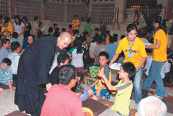 「爸爸最喜歡什麼?」「寶貝希望爸爸做的事?」「佛光山的開山宗長是誰?」「那些人可就讀叢林學院?」親子趣味有獎徵答小朋友爭先恐後搶答,場面熱鬧滾滾。親子講座邀請檀講師洪明郁主講「愛的能量」,幽默風趣的生活小故事,點出愛能發揮的能量,台上、台下互動熱烈。