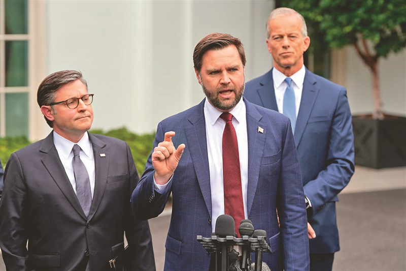 美國副總統范斯(中)與眾議院議長強生(左)、參院多數黨領袖杜恩(右)在白宮會議後,說明兩黨協商未果,政府關門危機升溫。圖/美聯社