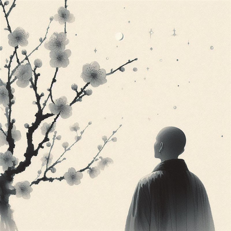 這首詩是唐朝無盡藏比丘尼到處訪道,後來開悟所作的。我們求道好比尋找春天,從清晨找到夜晚,可是仍然看不見春天的蹤影,走遍了千山萬水,把鞋子都磨破了,但是春天究竟在哪裡呢?心灰意懶之下,回到家裡,看到庭院中早開的寒梅,清香四溢,忍不住深深的一聞,原來春天早就悄悄地綻開在寒梅枝上了。