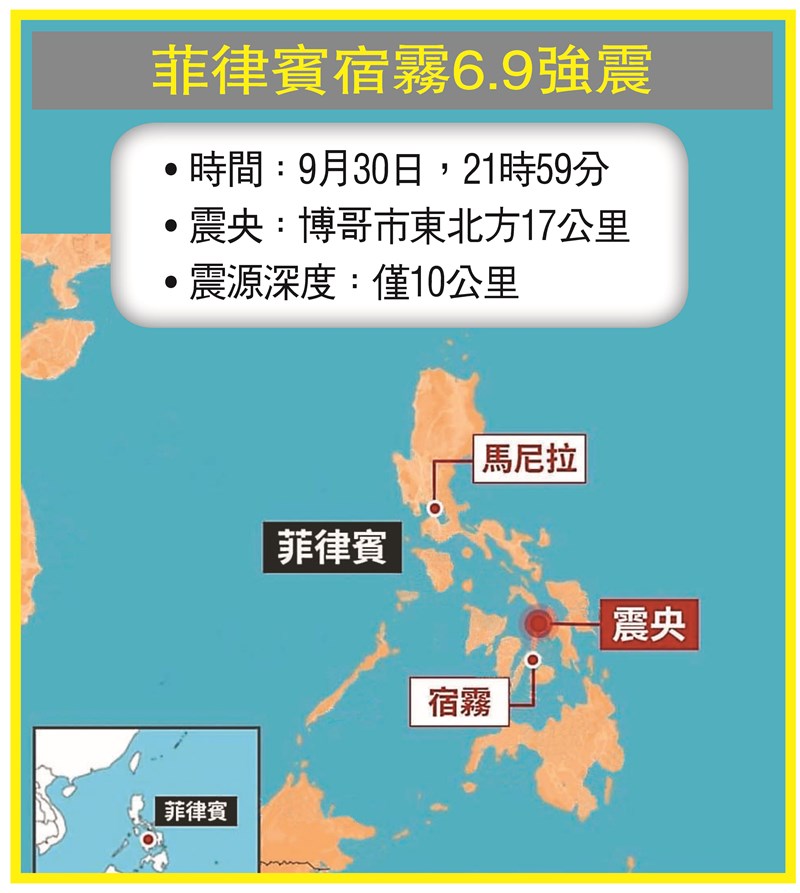 菲宿霧6.9強震 逾69死150傷 |2025.10.02 語音朗讀 69觀看次 字級 大 中 小 宿霧省塔博貢鎮一條主要公路,因強震造成巨大裂縫。圖/法新社菲律賓中部宿霧省發生規模6.9強震,救援人員在倒塌建築廢墟下,搜尋失蹤人員。圖/法新社菲律賓宿霧6.9強震 【本報綜合外電報導】菲律賓中部宿霧省(Cebu Province)外海,9月30日晚間9時59分發生規模6.9地震,震央位於博哥市(Bogo)東北方17公里,深度僅10公里,當地電力中斷、民眾摸黑逃生,至少69人罹難、逾150人受傷,政府展開搜救並致力恢復水電供應,但雨勢和道路橋梁受損阻礙救援。地震也導致多棟建築坍塌,部分山區發生落石及土石流。菲律賓災難風險縮減與管理委員會副行政官阿勒漢德羅1日下午在廣播節目證實前述罹難人數,半數是在接近震央、人口約9萬的宿霧省北部沿海城市博哥市,大多死於遭墜落的建築物結構砸中。菲律賓總統小馬可仕向罹難者家屬致哀,保證將迅速提供援助,並說已有內閣部長在現場指揮救援。宿霧省長巴瑞克瓦洛呼籲企業與民眾伸援,提供熱食與即食餐點,該省政府也接受各種形式捐助以協助受災民眾,包括義工、物資、運輸等。我外交部1日表示,暫無台灣民眾受困或傷亡通報,該部及駐菲代表處已向菲方表達慰問及提供人道救援協助的意願。美國駐菲大使卡爾森說,作為菲國友人、夥伴與盟邦,願意支持菲政府應對災情。日本、澳洲和歐盟也已表達慰問。餘震逾700起 海嘯警報解除美聯社報導,這次地震由海底斷層引發,震央在博哥市東北方約19公里,震源深度極淺。美國地質調查所指出,主震後當地又發生多起規模5以上地震。菲律賓火山與地震研究所所長巴科科爾說,截至1日晚間,餘震已共逾700起。該所一度發布海嘯警報,建議民眾遠離宿霧省和鄰近雷伊泰省、比利南省海岸線,但未傳海嘯發生,相關警告3個多小時後解除。偏遠市鎮麥德林與聖拉米吉歐也都傳死者。在聖拉米吉歐,除了3名海防隊人員和1名消防員喪命,另有1名兒童遭倒塌瓦礫壓死。菲律賓全國電網公司指出,地震後多條電線垂落,造成宿霧及周邊中部島嶼大規模停電。宿霧省救災官員拉莫斯表示,地震發生數小時後,市政人員仍在檢查倒塌的公共建築與一座體育館,兩者皆位於宿霧島北部,可能有人被壓在倒塌建築下。救難行動在聖拉米吉歐及博哥市展開,失聯人數暫不清楚。專家示警:恐有更大主震一名博哥市消防員卡內特說,地震破壞當地民宅水泥牆、一處消防局及道路;地震當下他和同事正準備休息,突然發生劇烈搖晃,「大家衝出營房,卻因震動過強跌倒」。針對本起地震,我國前氣象局地震測報中心主任郭鎧紋指出,規模6.9地震釋放能量相當11.3顆原子彈,預估未來一周還有規模6以上餘震,最高強度恐能達到6.4,甚至無法排除後面還有更大主震。 前一篇文章 川普與國會領袖協商未果 美政府今恐關門 下一篇文章 時隔近7年 美國聯邦政府關門停擺 熱門新聞 01佛光會啟動救災SOP 逾千人馳援光復2025.09.2702樂齡學苑開學 台北道場開啟長者生命力2025.09.2603台灣職排TPVL 首場賽事明開打2025.09.2604佛光山持續關懷 民生物資挹注光復鄉2025.09.2605吃完燒烤來顆綠奇異果 友善腸胃2025.09.2606【走讀城鄉】從圓山別莊、台北故事館到圓山別邸2025.09.2607黃金72小時 光復逾百人獲救2025.09.2608美阿靈頓鎮日 波士頓佛光童軍廣結善緣2025.09.2609沙子電池2025.09.2610北卡亞洲節 佛光人推廣佛教文化與素食2025.09.26 訂閱電子報 台北市 天氣預報 台灣一週天氣預報 相關報導 時隔近7年 美國聯邦政府關門停擺川普與國會領袖協商未果 美政府今恐關門全球AI算力 美奪冠、陸第2美商長:台美晶片產能 應五五分 加薩和平協議 有望達成佛光人愛心接力 挺進泥濘第一線