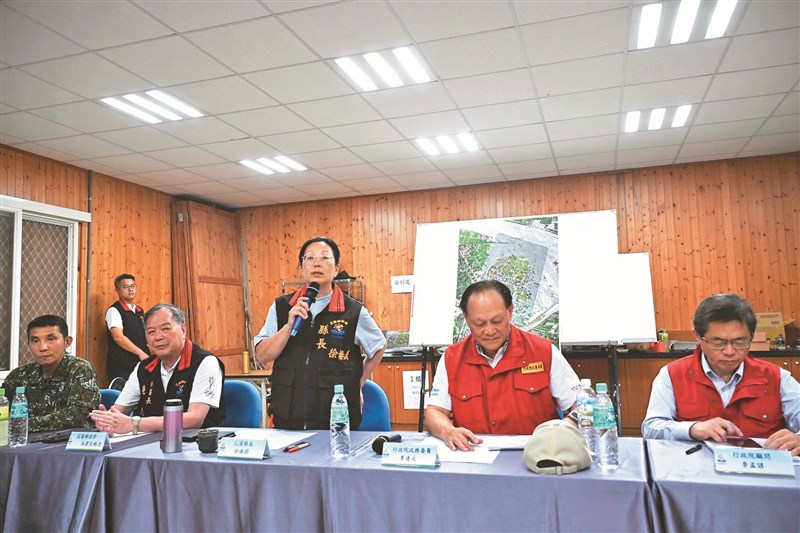 花蓮馬太鞍堰塞湖洪水重創光復鄉,其中,太平村、大同村共89戶因地勢低窪受創嚴重,縣長徐榛蔚(左3)向中央爭取中繼宅,並研議遷村計畫。右2為行政院政委季連成。圖/花蓮縣政府提供