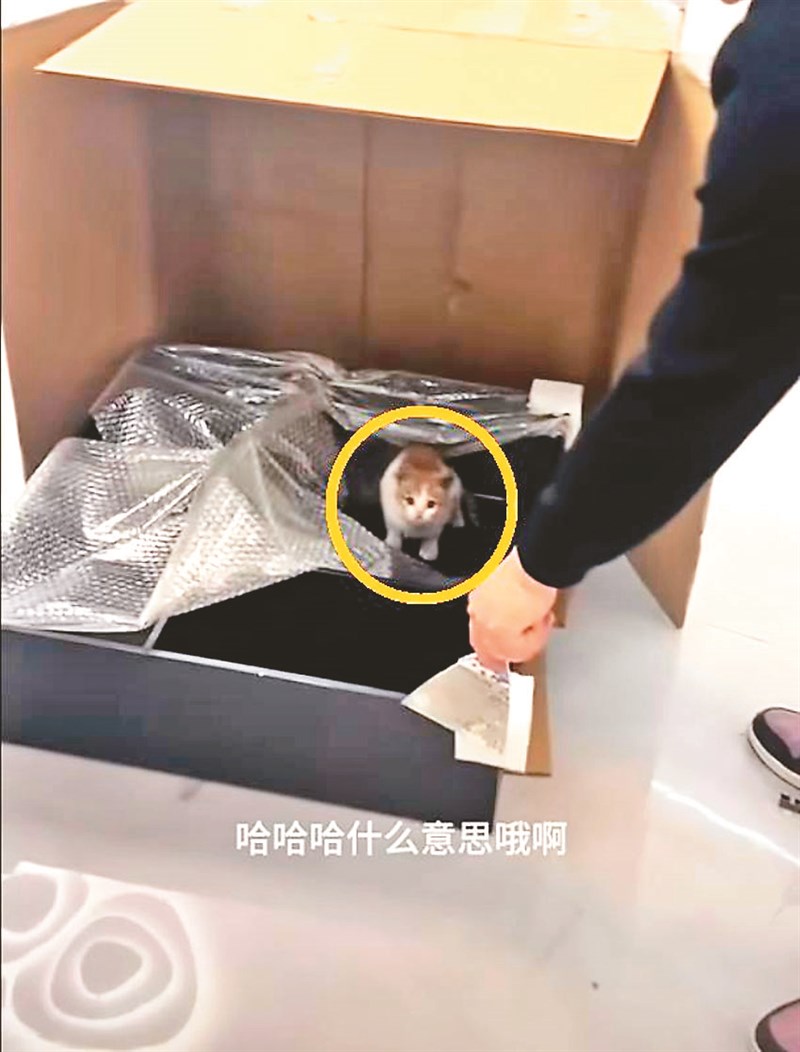 當一家人正開箱的時候,包裹再次傳出微弱的「喵喵」叫聲,小孩貼近一聽確認真的就在櫃子裡,讓家人加快動作想把小動物救出來。沒想到後來真的在櫃子背面發現一隻活生生的小貓,此時小貓終於「重見天日」,不停來回張望顯得有些害怕。