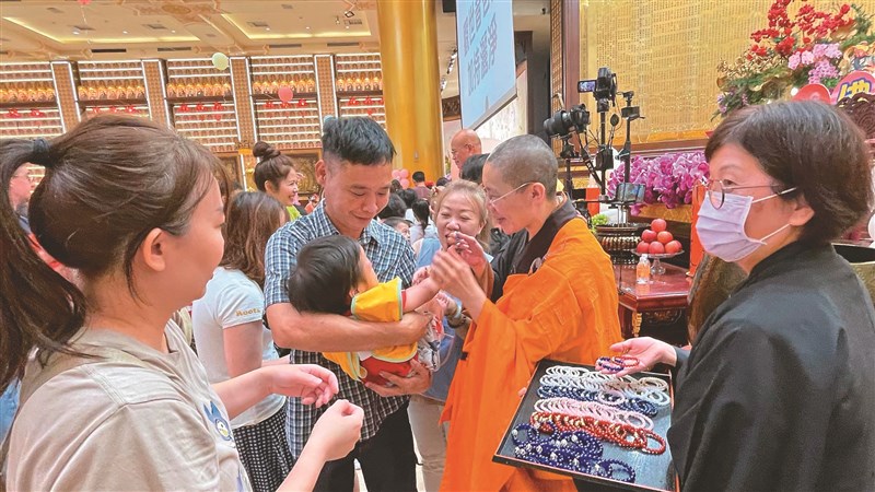 金光明寺住持有果法師(右2)以手珠與佛光寶寶、兒童結緣,祝福大家在佛光加被下健康快樂成長。圖/人間社記者趙裕隆
