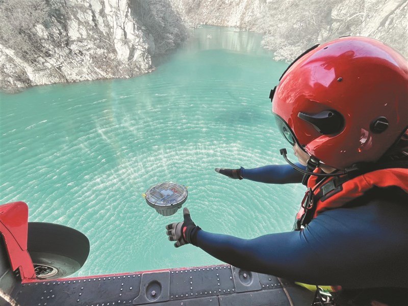空勤花蓮駐地黑鷹直升機,昨天載人員到堰塞湖投放小型水位觀測浮標,掌握蓄水量等數據。圖/內政部空中勤務總隊提供