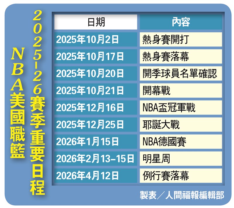 NBA新賽季 雷霆原班底拚連霸 張哲郢 |2025.10.03 語音朗讀 31觀看次 字級 大 中 小 NBA美國職籃2025-26賽季重要日程 製表/人間福報編輯部魔術莫里茲(左),將首次在家鄉德國出賽。圖/美聯社勇士柯瑞(左)與湖人詹姆斯,再度引領新賽季焦點對決。圖/美聯社溜馬主將哈利柏頓(左)因傷缺席整季,東區競局恐重洗牌。圖/美聯社雷霆保持去年原冠軍班底,由球隊核心亞歷山大(右2)領軍,新賽季持續挑戰連霸之路。圖/美聯社 文/記者張哲郢專題報導NBA美國職籃於2日正式進入官辦熱身賽階段,這意味著2025-26賽季即將到來,在日前NBA各隊都舉辦完媒體日,各自分享對於新賽季展望。例行賽將於21日開幕,當天由衛冕軍奧克拉荷馬雷霆出戰同區勁旅休士頓火箭,另場則是兩大人氣球隊金州勇士交手洛杉磯湖人。上季在MVP亞歷山大(Shai Gilgeous-Alexander)帶領下,雷霆拿到從西雅圖超音速改名後首座冠軍,新賽季冠軍班底依舊,且陣容還是很年輕,被看好又會是另個成功賽季。亞歷山大指出,如果新賽季雷霆沒拿到總冠軍,那他會感覺很糟糕,這是球隊新目標,要怎麼做到連霸,其實就是維持一樣,每天不斷進步,控制自己能控制的事情。上季拿到西區第2種子的火箭,季後賽被第7種子勇士擊敗,但跟雷霆不同的是,火箭季後大動作,送出格林(Jalen Green)以及布魯克斯(Dillon Brooks),換來聯盟得分好手杜蘭特(Kevin Durant),這正好補上火箭在關鍵時期缺發決定性球員跳出來的缺點,搭配其他才華洋溢的選手,讓火箭依舊維持高競爭力。已經37歲的杜蘭特說:「火箭有很多高IQ的球員,知道該怎麼做,接下來就是怎麼從開季第一天執行。」他表示,對他而言,現在最享受就是跟自己競爭,來到火箭感覺到球隊能理解他打球的方式,讓他有空間去做自己。同樣是老將代表,勇士柯瑞(Stephen Curry)與湖人詹姆斯(LeBron James)都分享對賽季的期待。柯瑞認為,他會持續保持對比賽的熱誠,跟團隊好好相處,把贏球視為優先,期許自己還能以好狀態再戰個幾年;快41歲的詹姆斯同樣表達還不想退休,他很開心能再次迎接自己最愛的籃球賽季。尼克、騎士 看好單季50勝從聯盟安排賽程來看,新賽季可能又是「西強東弱」的賽季,西區競爭十分激烈,季前預測有可能戰績在聯盟前段的隊伍,西區隊伍占據多數。紐約尼克與克里夫蘭騎士是少數被看好新賽季能突破單季50勝的東區球隊,尼克由布朗(Mike Brown)接任主帥,他知道球隊目標仍是要衝進總冠軍賽,這前提要建立在每天踏進球場就是全力以赴,而不是只有比賽時間。騎士一哥米契爾(Donovan Mitchell)表示,不管戰績第1還是第8都無所謂,騎士已經連3年在季後賽碰壁,有沒有辦法衝破這堵高牆,想辦法繼續努力,他相信球隊有能力可以做到。老將坐鎮 湖人、勇士人氣不減■球星對陣是NBA美國職籃傳統好戲,當今兩大人氣隊伍金州勇士與洛杉磯湖人,正是有柯瑞(Stephen Curry)及詹姆斯(LeBron James)兩位史詩球星坐鎮,使兩隊在新賽季依舊大有看頭。勇士隊上季在季後賽止步,留下遺憾。若非當家球星柯瑞在系列賽後段因傷缺陣,球隊原本有機會延續「下克上」的驚奇表現。高層上季找來攻防一體的悍將巴特勒(Jimmy Butler),大大減輕柯瑞的壓力,加上防守、策應能力出色的格林(Draymond Green),這是勇士組成平均年齡破36歲的「老三巨頭」後,迎接首個完整賽季。此外,勇士也簽下具有外線火力柯瑞的弟弟塞斯(Seth Curry),兄弟倆首度連線,也在開季前完成與庫明加(Jonathan Kuminga)的合約,並簽下老將中鋒霍福特(Al Horford),陣容變動不大還升級。同樣是老將,年底滿41歲的詹姆斯不輕易言退,而且隊上還有新生代全能後衛唐西奇(Luka Doncic)接班。湖人本季補強策略有別以往不再單純圍繞詹姆斯,而是著重配合唐西奇,特別引進防守見長的後衛史馬特(Marcus Smart)。若唐西奇能妥善管理健康狀態,不僅能讓詹姆斯獲得更多喘息空間,也能在上場時維持高效輸出。三巨星缺陣 衝擊球隊戰力■上季NBA美國職籃季後賽,從里拉德(Damian Lillard)、泰托姆(Jayson Tatum)到哈利柏頓(Tyrese Haliburton)等三大球星,皆因阿基里斯腱受傷退出賽場,可能影響到本季球隊戰力規畫。要論這當中影響最大莫過於哈利柏頓,這位新生代控衛球星,上季帶領印第安那溜馬闖總冠軍賽,卻因為受傷導致奪冠夢碎,甚至整個25-26賽季都得缺席。加上陣中哈利柏頓缺席,及透納(Myles Turner)轉至密爾瓦基公鹿,溜馬在開季前普遍被認為今年會陷入低迷,要複製上季奇蹟難度很高。另外,里拉德轉戰老東家波特蘭拓荒者,公鹿改以「字母哥」安戴托昆波(Giannis Antetokounmpo)為主打造陣容,但仍面臨後衛的破壞性不足。至於波士頓塞爾蒂克的泰托姆,由於復原速度超前,他已經能參與球隊訓練,這對綠衫軍來說是好現象,球隊可以寄望他在賽季尾聲回歸。綠衫軍先前是以雙核為架構,扛下主戰的布朗(Jaylen Brown)本身是後場球員,具有一定組織能力,相較於其他2隊,綠衫軍有豪瑟(Sam Hauser)補上泰托姆空缺,雖然火力有落差,但也是測試原先板凳實力,能否適時補上不要讓球隊戰績衰退太厲害。海外例行賽 首度移師德國■NBA美國職棒海外舉行例行賽已行之有年,新賽季將再次解鎖全新地區,首次移師德國柏林舉辦,由奧蘭多魔術出戰曼菲斯灰熊,德國也是魔術陣中知名兄弟檔韋格納(Wagner)家鄉,2人迫不及待想在鄉親父老前獻技。最早在1984年,NBA就有舉辦過海外賽,當時在義大利米蘭舉辦,真正首場海外例