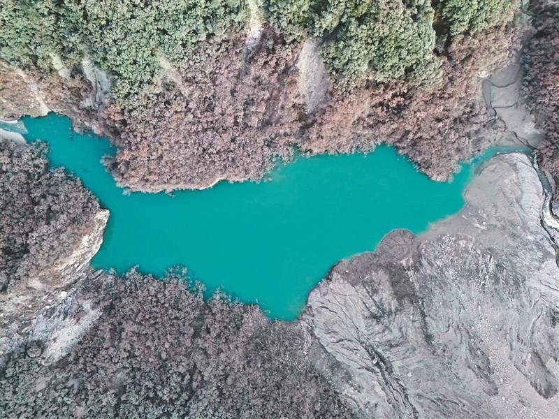 花蓮馬太鞍溪上游堰塞湖狀況穩定,但前內政部長李鴻源擔心,一旦地震或豪雨,可能再次形成堰塞湖。圖/林業保育署提供
