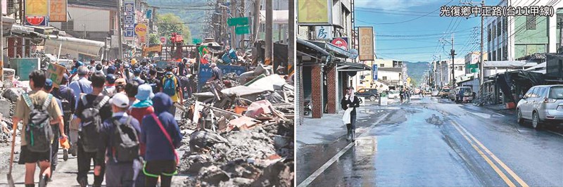 光復鄉災區早前滿目瘡痍(圖左),如今多已將淤泥鏟出(圖右),僅剩少部分路段等待大型機具進駐清除。圖/資料照片、洪子凱攝影