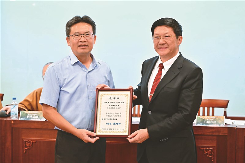 台南市中小學校長協會理事長陳明和(左)致贈感謝狀,感謝積極推動讀報教育,中華福報生活推廣協會理事長楊政達代表接受。