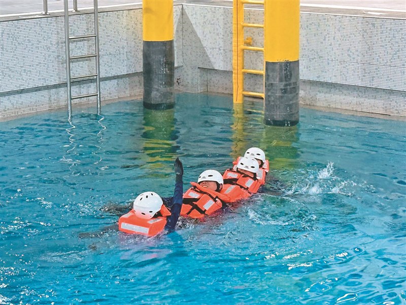 「海洋科技產業創新專區」離岸工程中心近日正式啟用,擁有國內首座深水試驗水池,可模擬真實海域風、波、流的極端環境,包含造出俗稱「瘋狗浪」的巨浪,提供國內浮式風電、波浪能及水下電纜等試驗。專區的人才培訓中心至今累計培訓3730人,圖為離岸作業人員海上求生相關培訓示範。圖/中央社