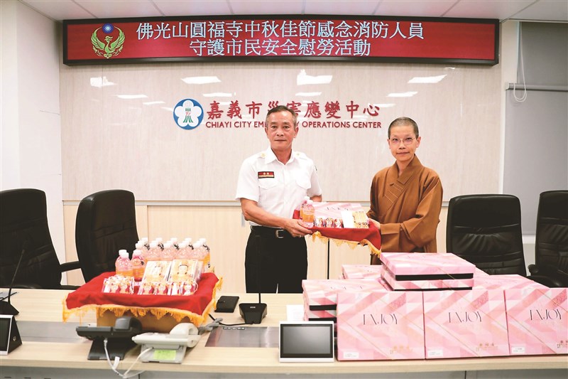 佛光山圓福寺住持覺禹法師(右)帶領國際佛光會中華總會嘉義區佛光人,贈送消防人員中秋月餅、大悲咒水等結緣品,感謝消防人員的辛勞奉獻。圖/人間社記者曾文正